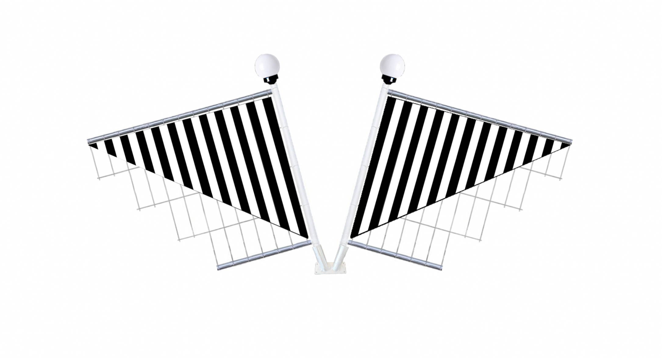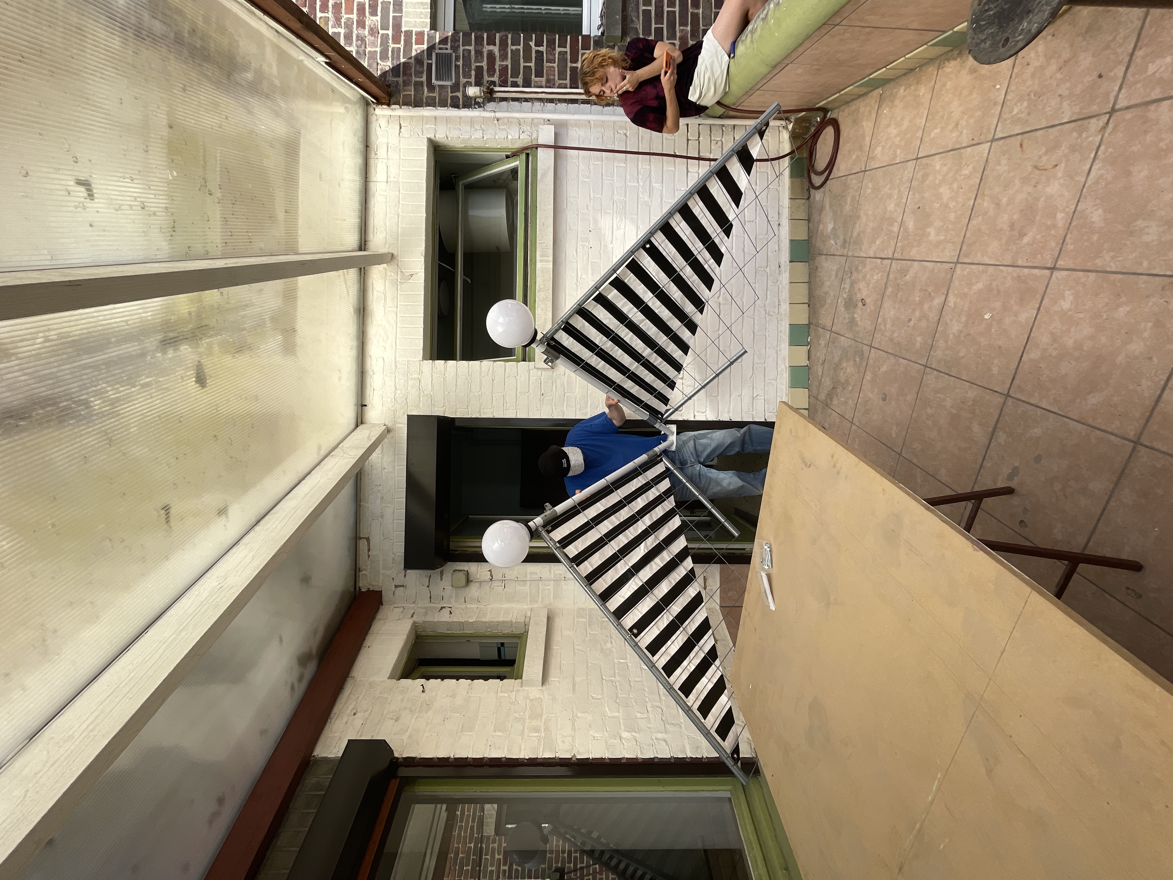 Verloren Bekisting was asked by Maurits Verstraete to contribute to the ‘Vlaggenhouder’ project for Sorry not Sorry where artists were invited to make an object for a flagpole holder to be placed on a corner house in the Arsenaalstraat, Gent. For our object, Black Flag, a found construction fence was manipulated by cutting it in half and placing both ends in a double flagpole holder. The two vertical tubes of the fences were painted white to give the impression of a vertical flagpole, topping it off with two solar lamp bulbs. The flags consist of two triangular white tarps, which were leftover from our Duivelsteen stage from last summer, and black duct tape was added to create a stripped pattern.