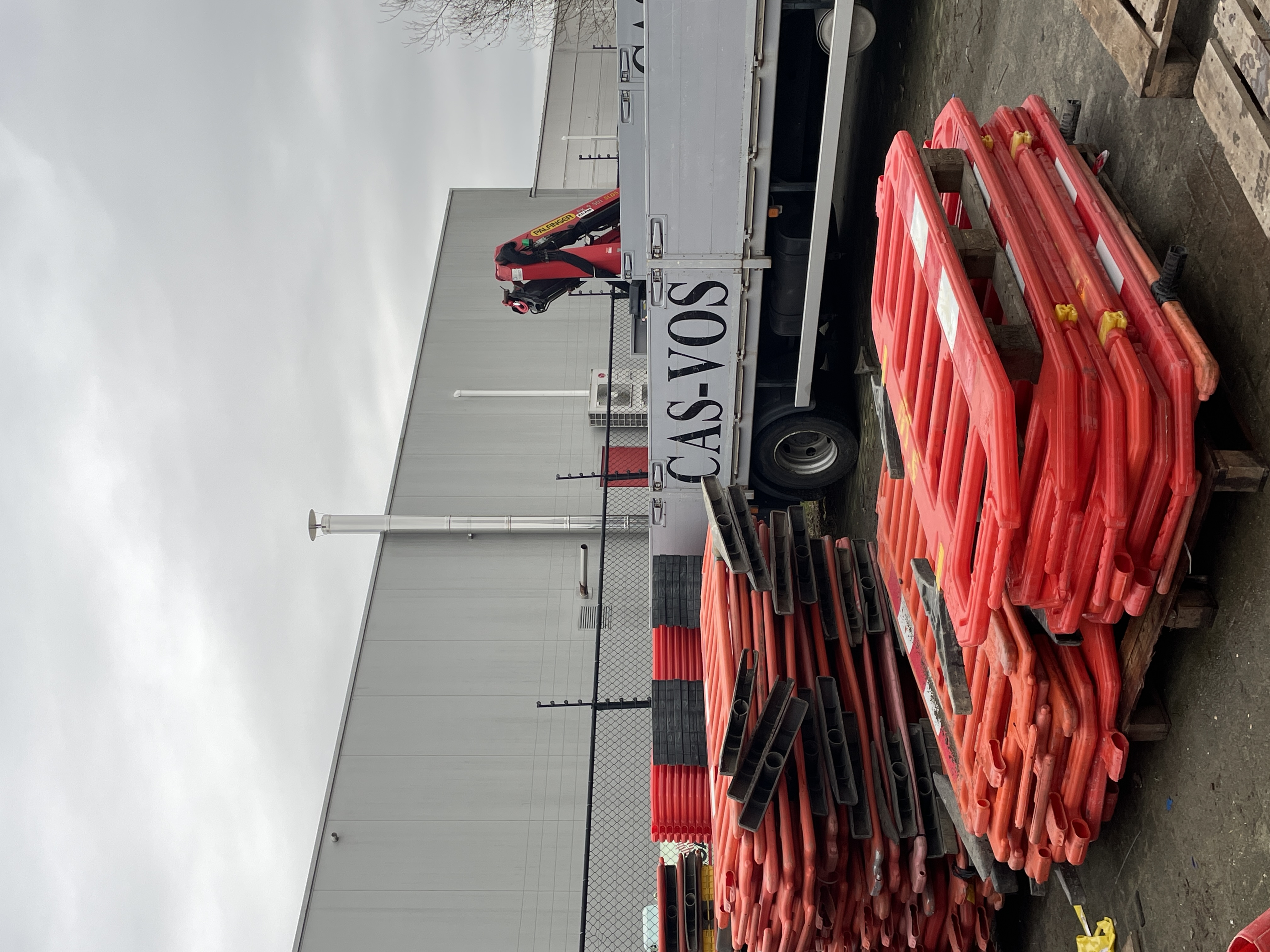 Verloren Bekisting was asked by Grid and no.id to make a scenography for their event at Funke for Cluster 2024. We reused the construction lamps from our previous scenography at Broei and we borrowed 10 construction fences from Cas-Vos. One fence in front of each facade opening: a balustrade in front of each window. By putting the lamps directly on top of each fence the facade randomly illuminates at night.