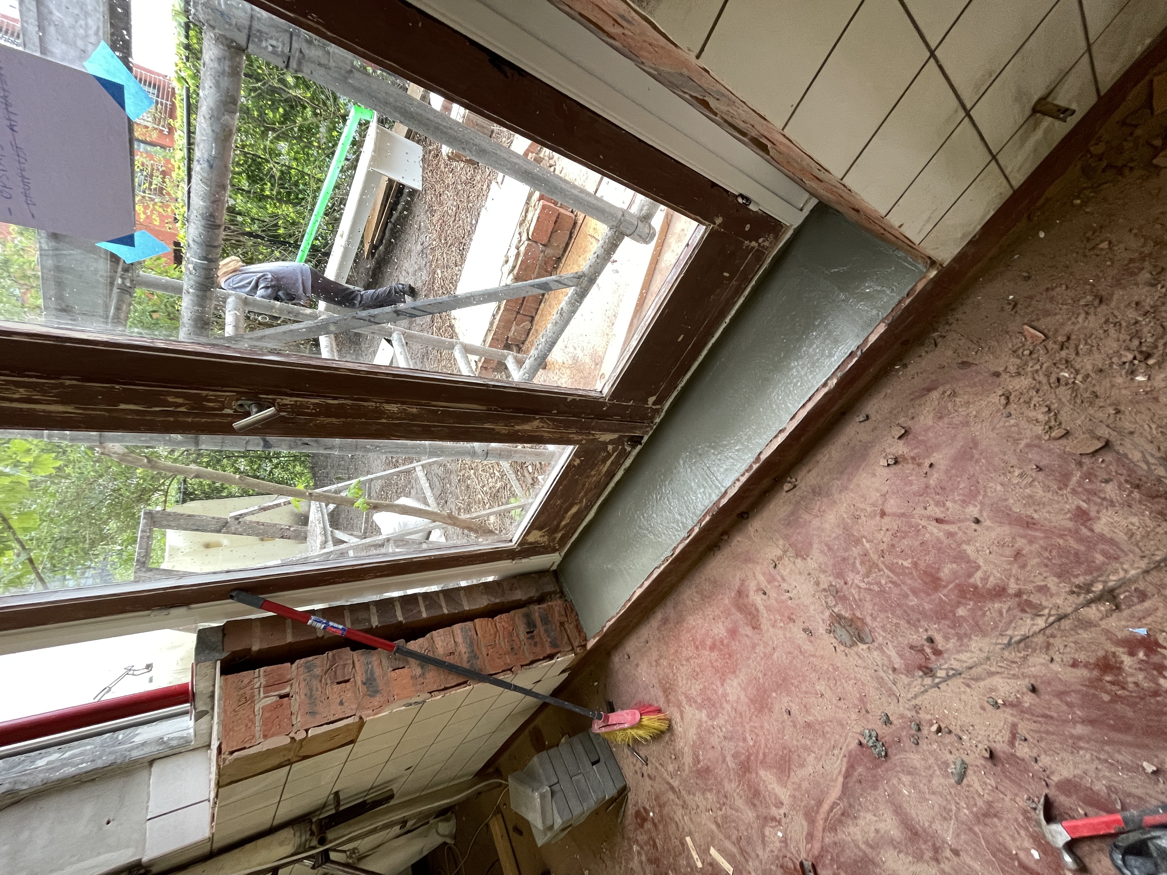 Verloren Bekisting is continuing its research within the building of WD40, a temporary projectspace and artist residence in a former garage building. Here we study how the existing building can be transformed merely by using the material available in the building already. The first intervention being a connection between the exhibition space and the inaccessible garden at the back of the building. We made this connection happen by intervening with the existing opening between the exhibition space and the garden. This opening of the facade was filled with glass bricks in a concrete grid, both falling apart. By removing the existing glass bricks, cutting away a part of the concrete grid and adding a new transparent layer, light on the south facade could now enter the space. Two clean cuts were made in the existing wall to create a passage to the garden. The piece of wall removed was laid down flat in the garden and created a step, bridging the height difference between inside and outside. No material wasted. Suddenly the tiles of the interior become a part of the garden. On the first floor of the building, a large door frame was taken out between the kitchen and adjacent loggia. Creating a bigger kitchen space. This door was moved to the garden, painted, and hung on the facade in front of the new opening.