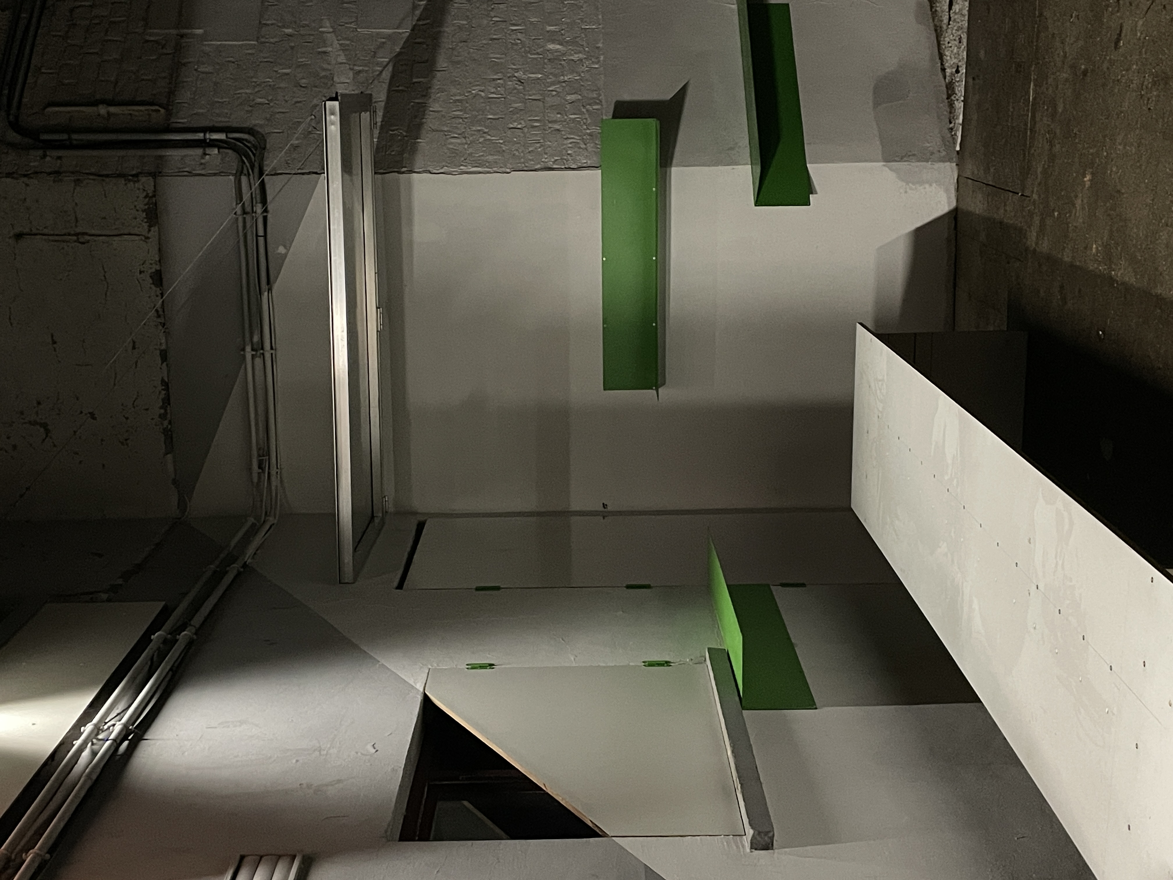 Verloren Bekisting was asked by Lochness to make a scenography for an outdoor space of their new location at the Kortrijksesteenweg. We made an inventarisation of the materialshed of Lochness. We were interested in their leftover white paint, white melamine boards, PVC pipes/tubes, steel sheets, door hinges and aluminium windows. All this material was reused for the scenography. No new material was bought and the design faced the consequences of the material that was there. Taking away paint from the glass on the door reveals light from the interior space. The tool decides the dimension of the new openings. A broken clock was used as a sample to cut away half a circle to make room for the door handle. The PVC that was cut away for the lamps on the roof turned into an ashtray together with the clock. The old green skate rail of Lochness their residency at the Kunsthal became the backrest of a bench and the catalyst to paint all the other leftover steel in green as well. A big door handle and wall shelves to put your beer cans on. Through the act of painting the backdrop white, light is more present and makes the interventions graphically visible so the surfaces of the existing walls disappear.