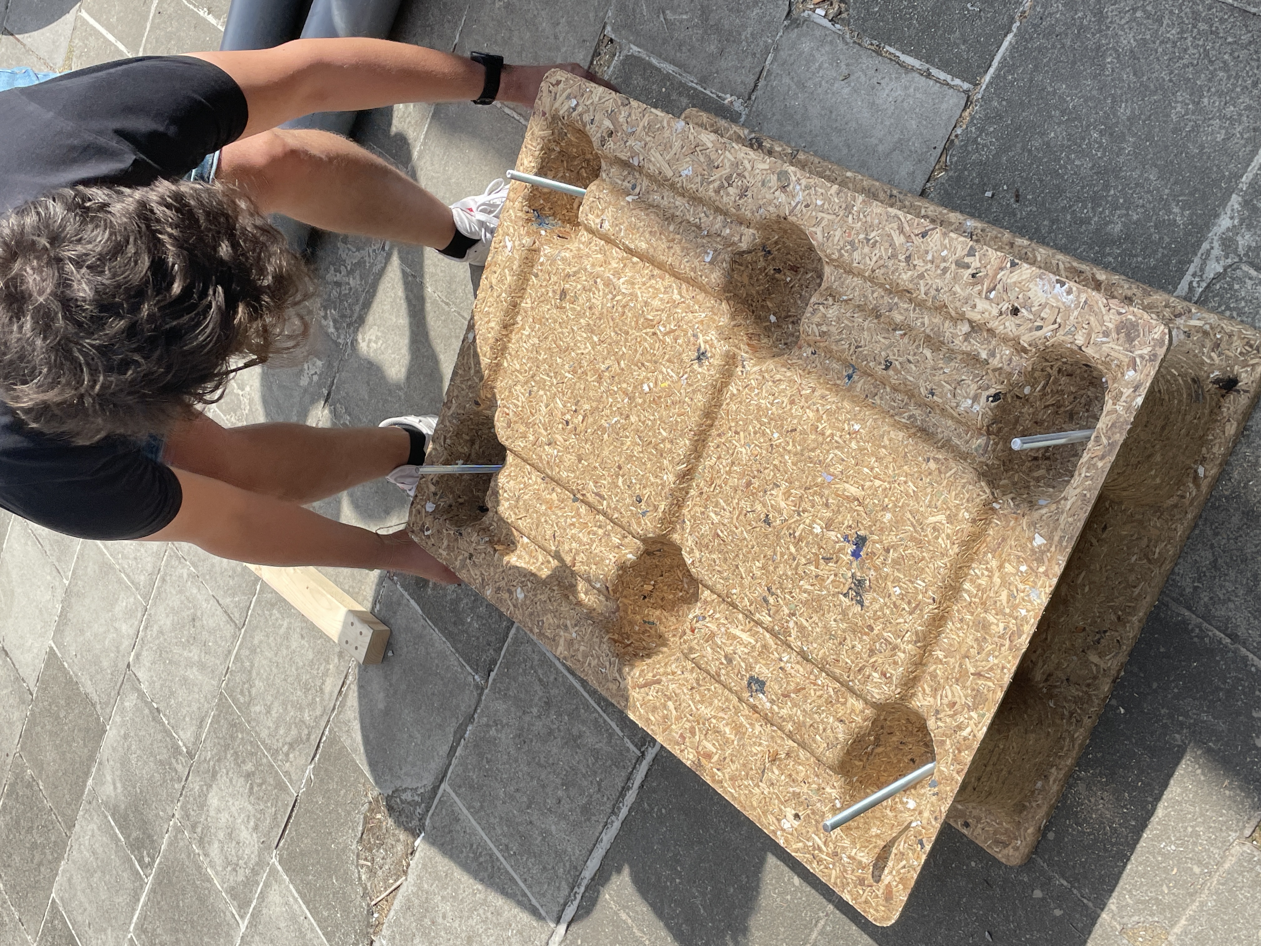 Something Fantastic to Sit Together was a self-initiated series of 3 workshops where, together with 25 participants, leftover building material from construction containers were scavenged and turned into tables, chairs, lamps and other objects. A selection of the workshop results was exhibited as part of the Young Talent selection at the Belgian Art & Design Fair Gent 2023.