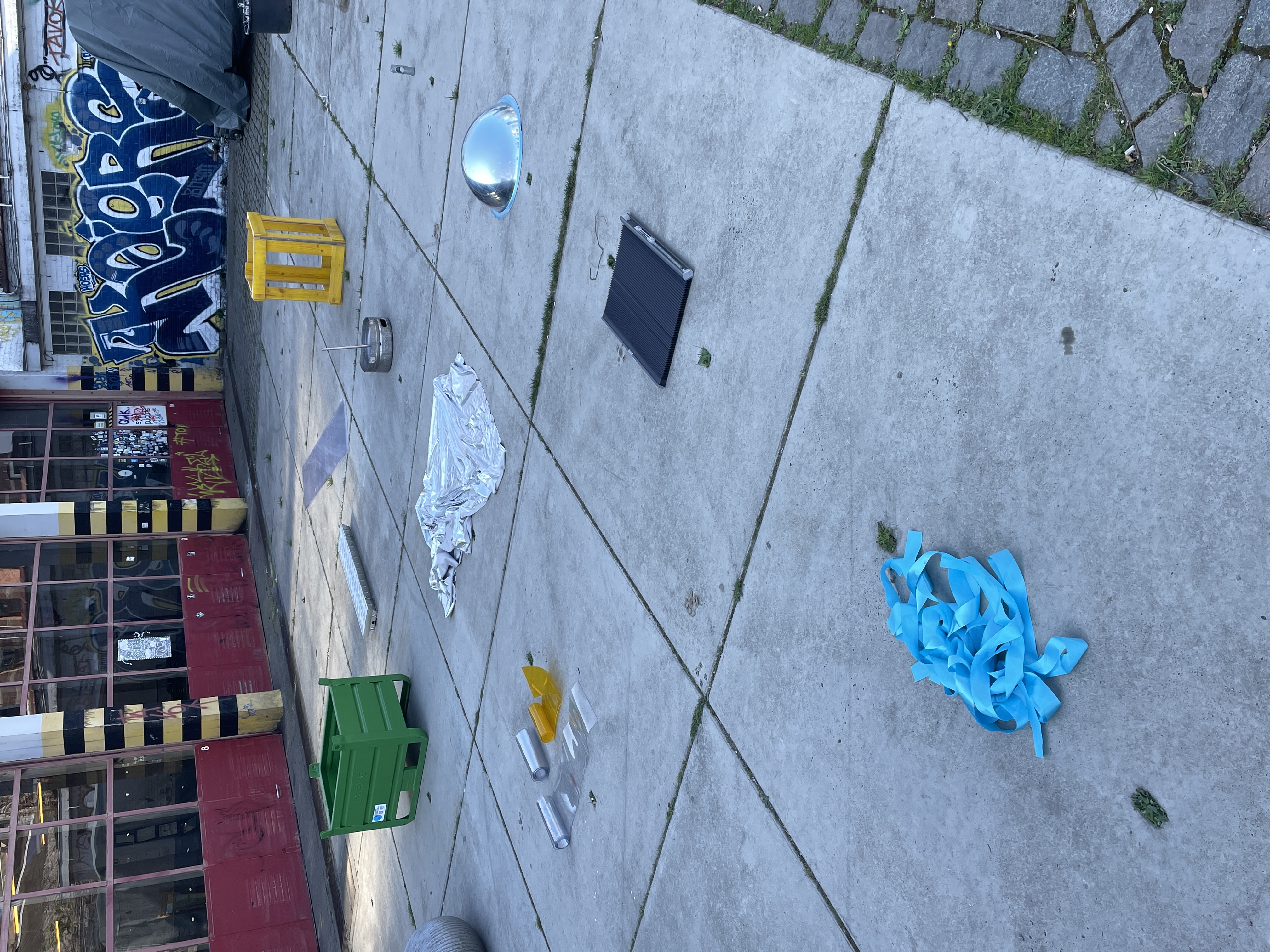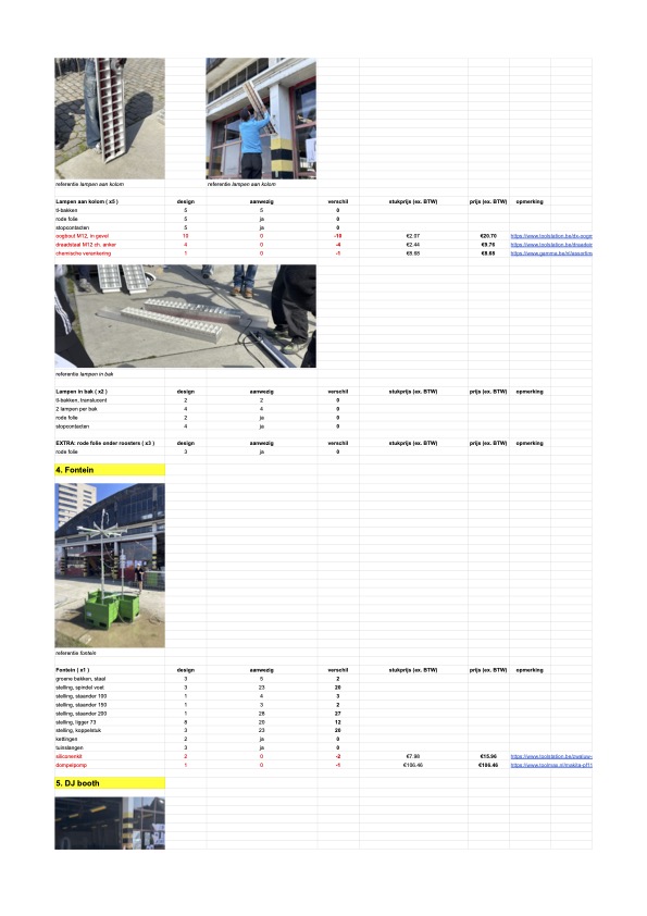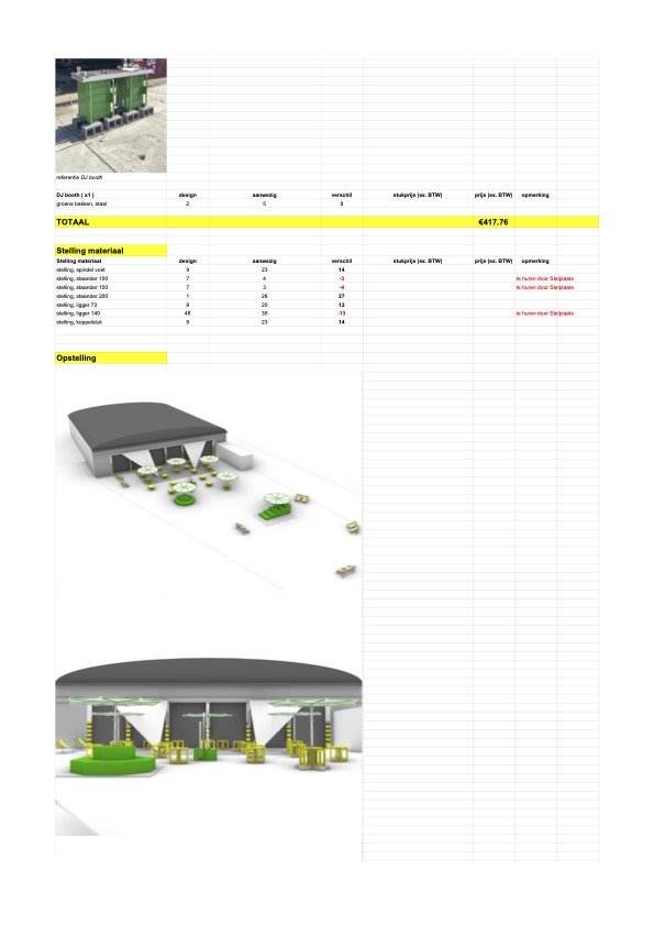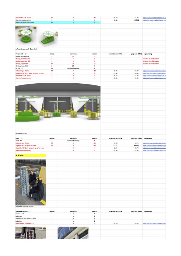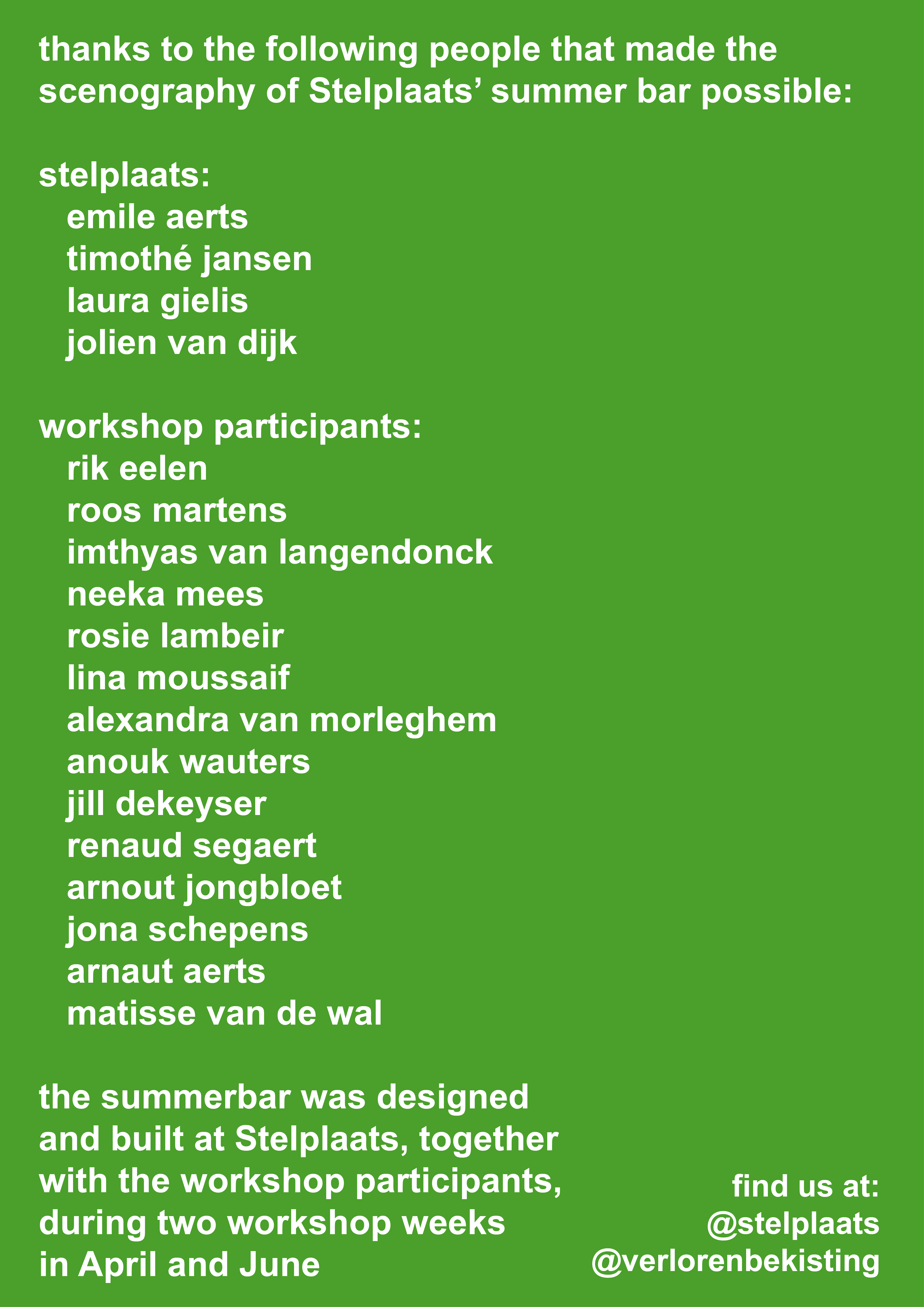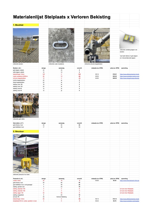Verloren Bekisting was asked by Stelplaats to design and build their yearly summerbar for the first time in workshop format. Together with Stelplaats’ workshop participants we hosted a workshop week where material was scavenged out of the Stelplaats storage. We found their material from previous years’ editions of the summerbar, which seemed enough to create a new summerbar scenography. Playing together with the material out of the storage, creating immediate 1:1 mockups of structural elements, furniture, a fountain, a DJ booth and lighting elements. An intuitive process of making, stacking and drawing followed and concluded with an elaborate 3D model and excel sheet describing the new summerbar scenography. After this, a second workshop week followed where we, together with Stelplaats’ workshop participants, built the summer bar scenography. For shading scaffolding together with white tarp makes parasols. The white triangular tarps from Duivelsteen 2 were fully reused. For seating a beach chairs is are reimagined in scaffolding and striped plastic sheets. A fountain emerges out of scaffolding and green steel storage units. Existing wooden furniture blocks are revamped with a new layer of paint. From the design to the execution, everything happened on site, at Stelplaats.