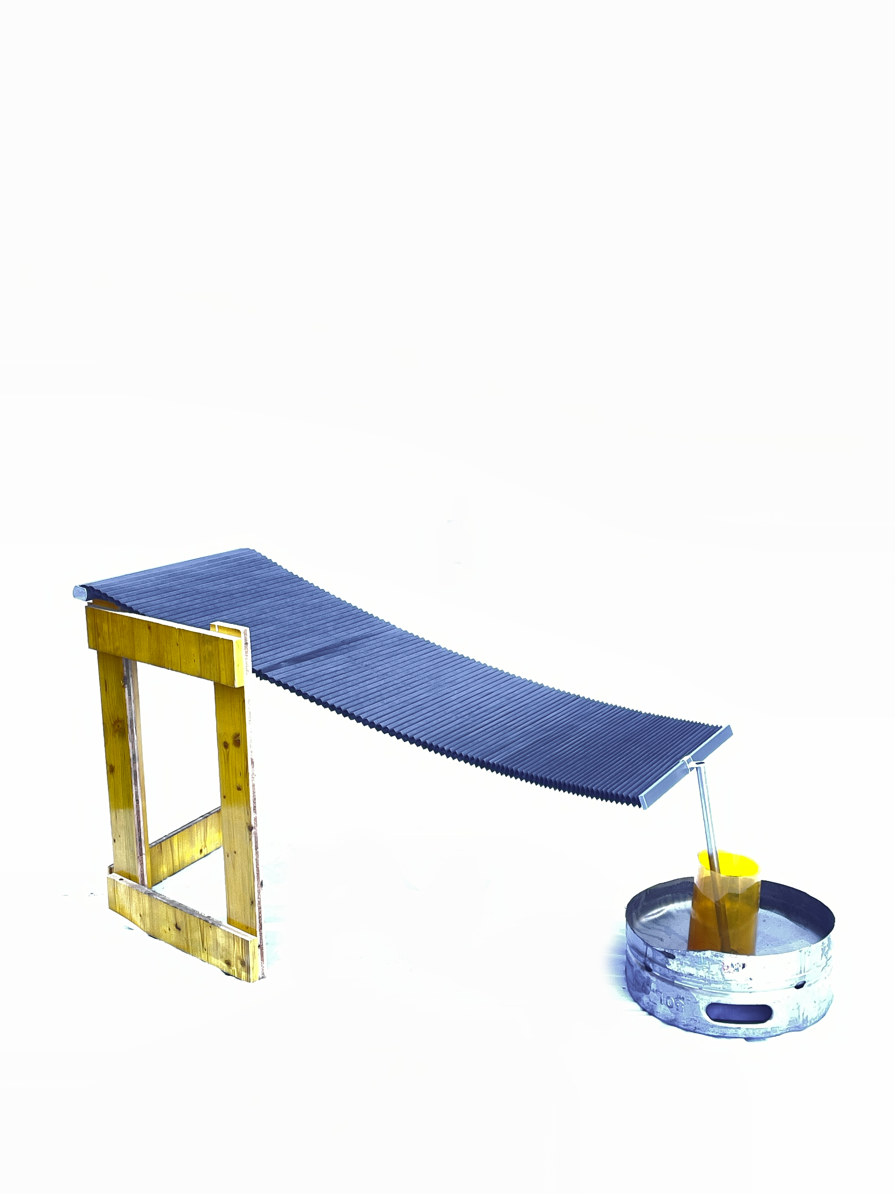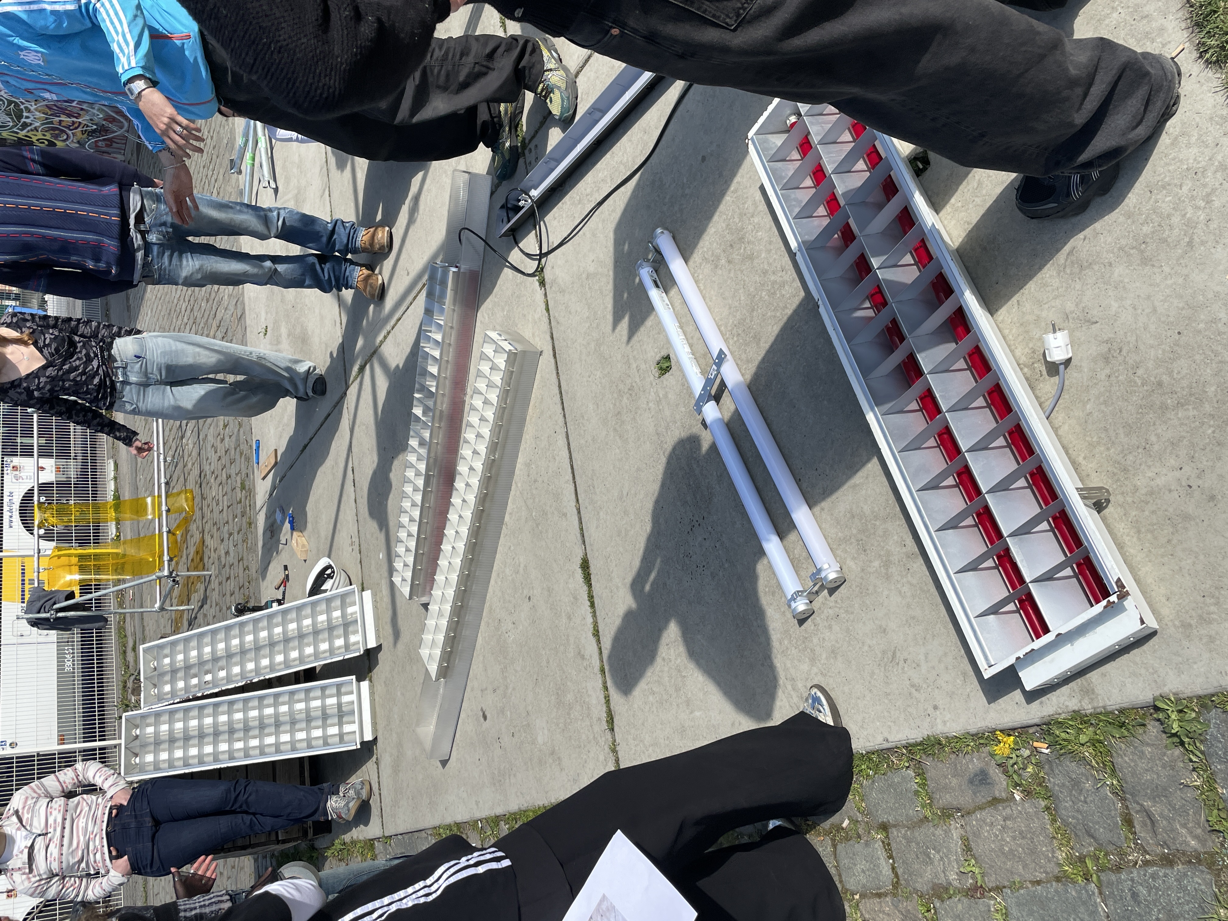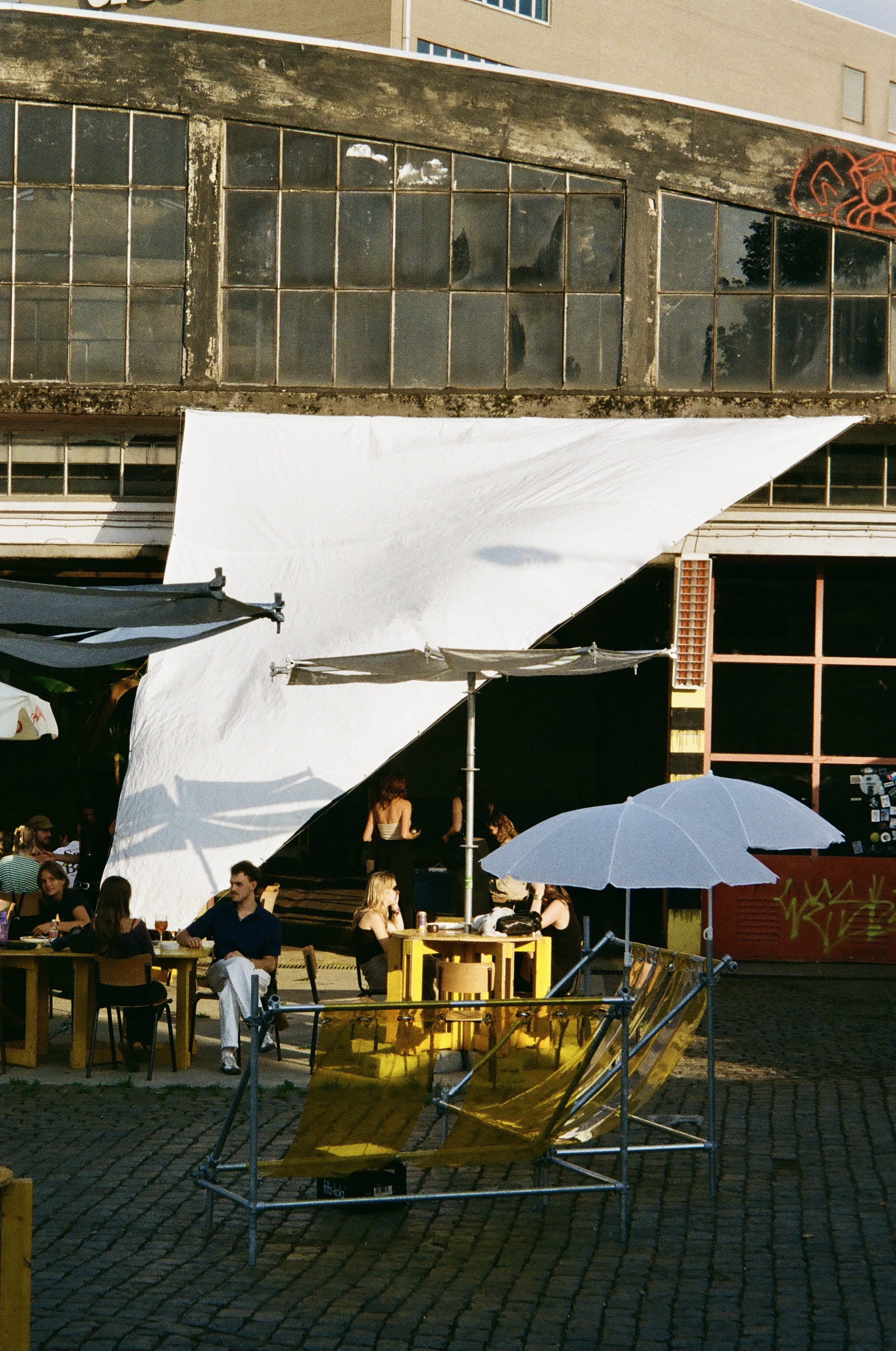 Verloren Bekisting was asked by Stelplaats to design and build their yearly summerbar for the first time in workshop format. Together with Stelplaats’ workshop participants we hosted a workshop week where material was scavenged out of the Stelplaats storage. We found their material from previous years’ editions of the summerbar, which seemed enough to create a new summerbar scenography. Playing together with the material out of the storage, creating immediate 1:1 mockups of structural elements, furniture, a fountain, a DJ booth and lighting elements. An intuitive process of making, stacking and drawing followed and concluded with an elaborate 3D model and excel sheet describing the new summerbar scenography. After this, a second workshop week followed where we, together with Stelplaats’ workshop participants, built the summer bar scenography. For shading scaffolding together with white tarp makes parasols. The white triangular tarps from Duivelsteen 2 were fully reused. For seating a beach chairs is are reimagined in scaffolding and striped plastic sheets. A fountain emerges out of scaffolding and green steel storage units. Existing wooden furniture blocks are revamped with a new layer of paint. From the design to the execution, everything happened on site, at Stelplaats.