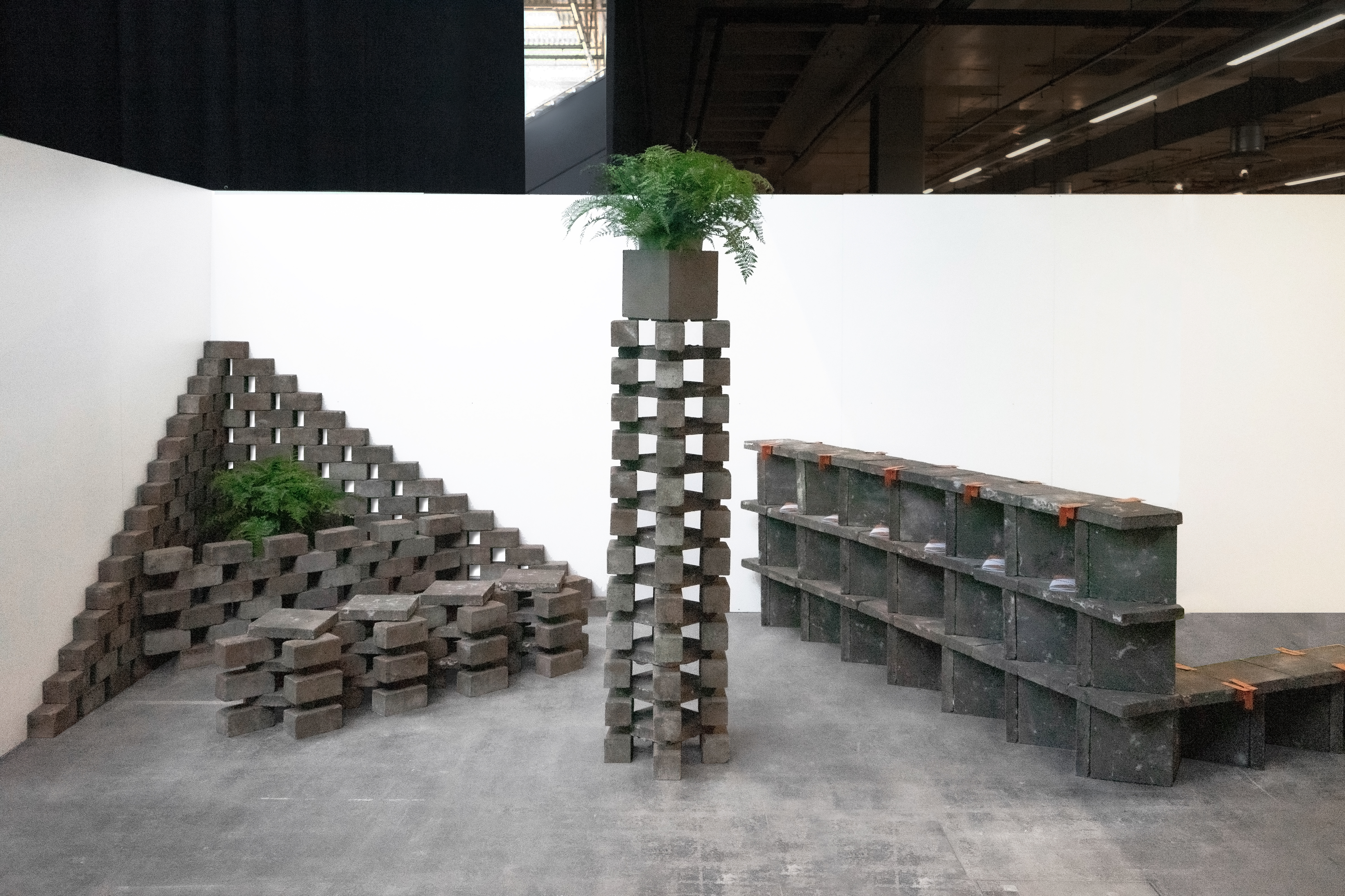 Verloren Bekisting was asked by Breekijzer vzw to propose a series of furniture and objects for @vktegelwippen. This campaign aims to break out concrete tiles and bricks and revive green surfaces. Verloren Bekisting developed multiple applications for these tiles and bricks, which otherwise would be thrown away. Our installation proposes a series of objects: a planter, a bench, a column, and a shelf. To connect the tiles, a clamp was created made up of two metal beam carriers tied together with cable ties that keep the construction of the shelf stable. These beam carriers are available at every local construction market. The manual explains in steps how one could make these objects after concrete tiles and bricks have been taken out of their yard or sidewalk. The design focuses on accessible connections and local assembly. This way, the heavy material does not need to be transported to a different location in order to get a new function.